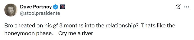 Taking to X on Tuesday, Portnoy wrote: ‘Bro cheated on his gf 3 months into the relationship? Thats like the honeymoon phase. Cry me a river’.