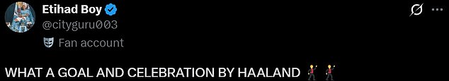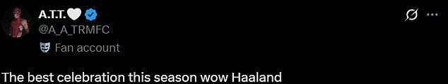 An extra user said: ‘What a goal and celebration by Haaland,’ before a further fan quipped: ‘The best celebration this season wow Haaland.’