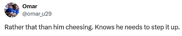 ‘Rather that than him cheesing,’ added another. ‘Knows he needs to step it up.’