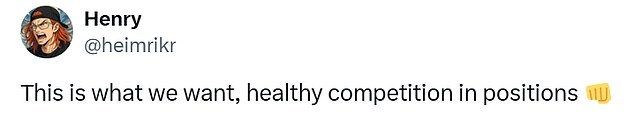 A fifth user agreed, saying: ‘This is what we want, healthy competition in positions.’