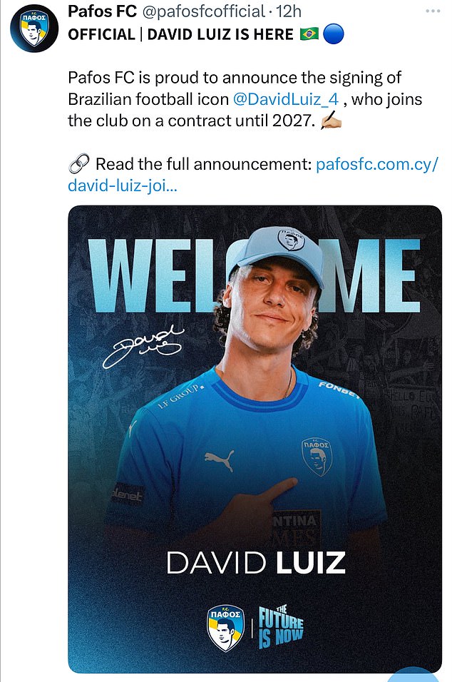 A statement from the club, who won the league by seven points last season, read: ‘Pafos FC is proud to announce the signing of Brazilian football icon David Luiz, who joins the club on a contract until 2027.