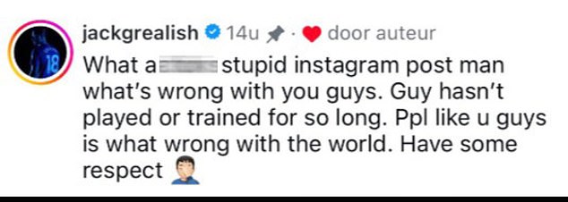 Grealish, 30, responded: ‘What a f*****g stupid Instagram post man what’s wrong with you guys. Guy hasn’t played or trained for so long. Ppl like u guys is what wrong with the world. Have some respect.’