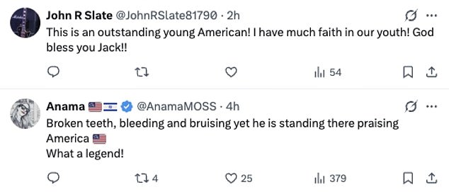 One wrote: ‘Broken teeth, bleeding and bruising yet he is standing there praising America. What a legend!’