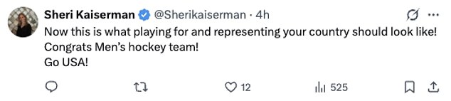 Another added: ‘Now this is what playing for and representing your country should look like! Congrats men’s hockey team! Go USA!’
