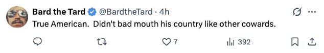 Other Americans joined in the praise, with one commenting: ‘True American. Didn’t bad mouth his country like other cowards.’