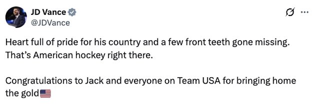 Vice president JD Vance led American praise for ‘patriot’ Jack Hughes after his pro-USA celebrations in the wake of their hockey gold medal at the Winter Olympics.