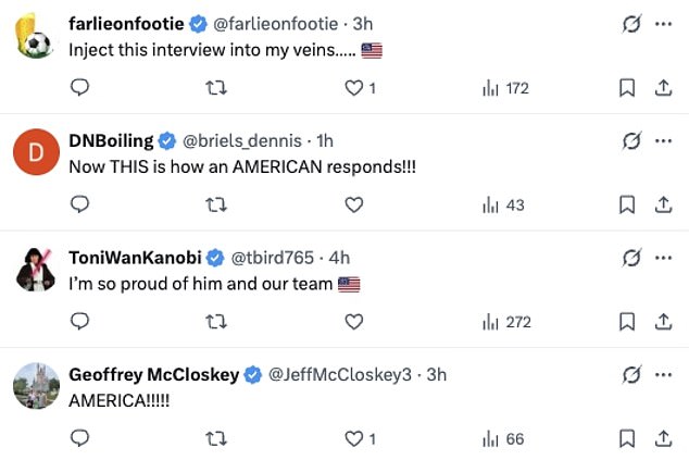 His response led to a flurry of praise from his fellow Americans on social media, including from Vance who wrote on X: ‘Heart full of pride for his country and a few front teeth gone missing.