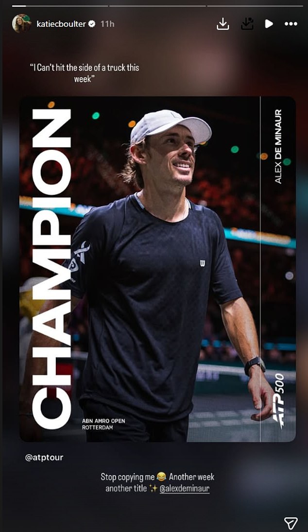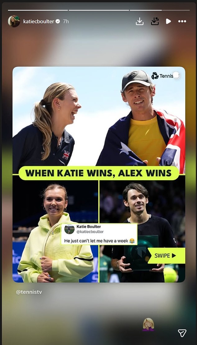 Katie Boulter has sent a cheeky message to her Aussie partner Alex de Minaur after he snapped his ATP title drought in the Netherlands on the weekend.