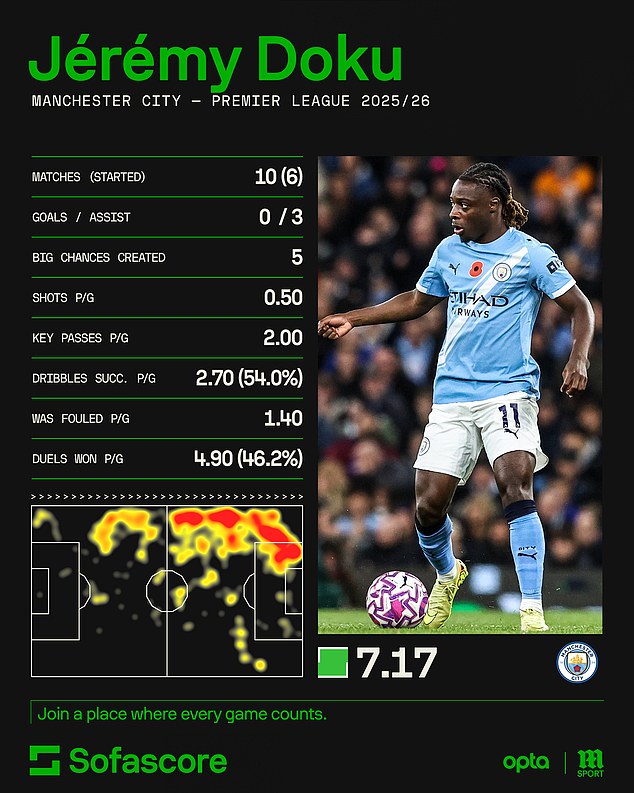 When Doku has been in full flow, he’s been unstoppable and will look to take his form into the game against a Liverpool right hand side that has struggled all season.