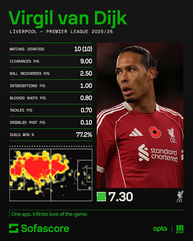 Seasons have come and gone, but his status in the game has only grown. Although Liverpool have struggled this season, he has maintained his dominant performances, boasting 87 per cent aerial duels won and having an average rating of 7.29.