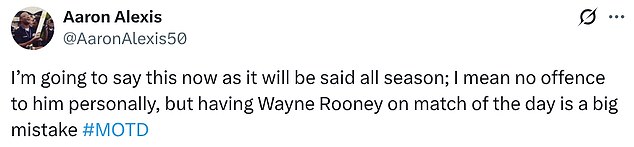 One X user said: ‘I’m going to say this now as it will be said all season; I mean no offence to him personally, but having Wayne Rooney on MOTD is a big mistake.’