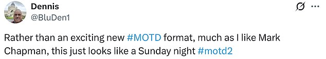 ‘Rather than an exciting new #MOTD format, much as I like Mark Chapman, this just looks like a Sunday night,’ one X user posted.