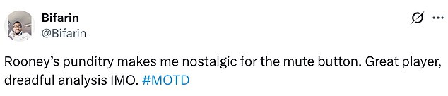 Another was underwhelmed with the standard of the post-match discussions, adding: ‘Rooney’s punditry makes me nostalgic for the mute button.
